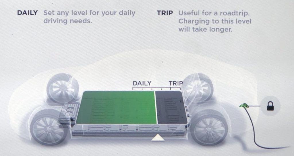 First, in most Tesla’s, the car displays some indicators on the charging screen about Daily vs Trip charging limits. The implication is that you should keep the charge limit somewhere in the Daily charging limit range most of the time. which is usually anywhere from 50% to 90% battery state of charge. The Trip charging limit range goes from 90% to 100% (and sometimes 80% to 100%). The implication of that one is that you should only charge that much when you really expect to need the extra miles of range … such as a long trip.